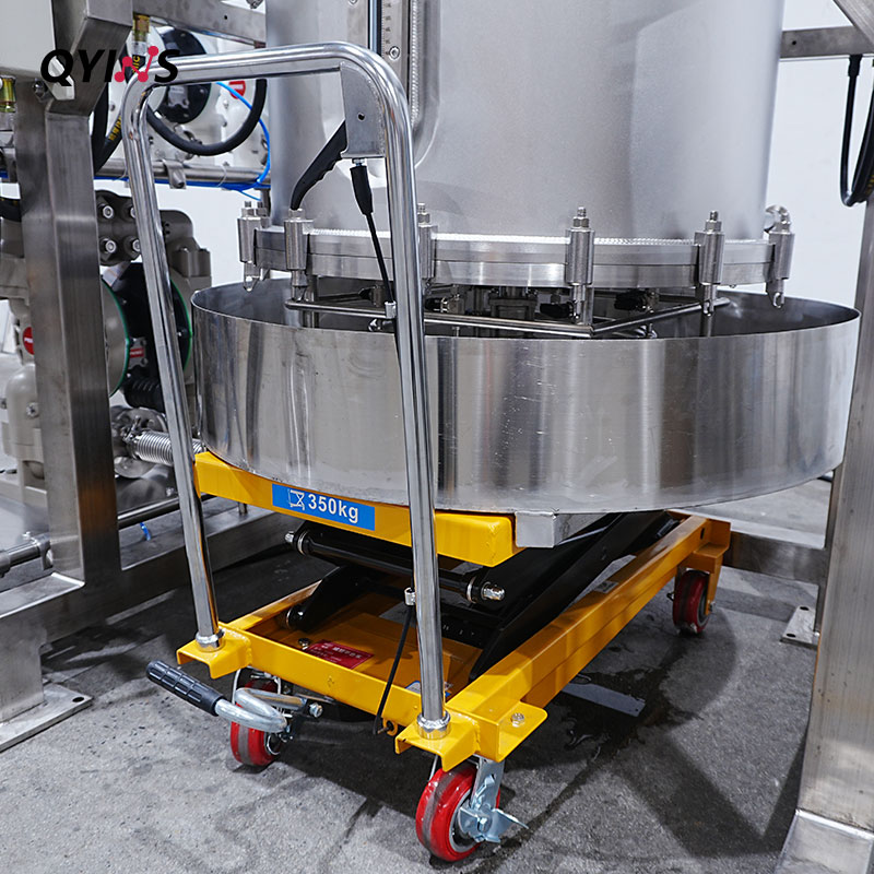 可移動(dòng)升降接料小車+不銹鋼托盤,輔助使用人員快速安裝或拆卸過濾裝置,便于收集固狀粉狀物料。